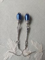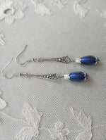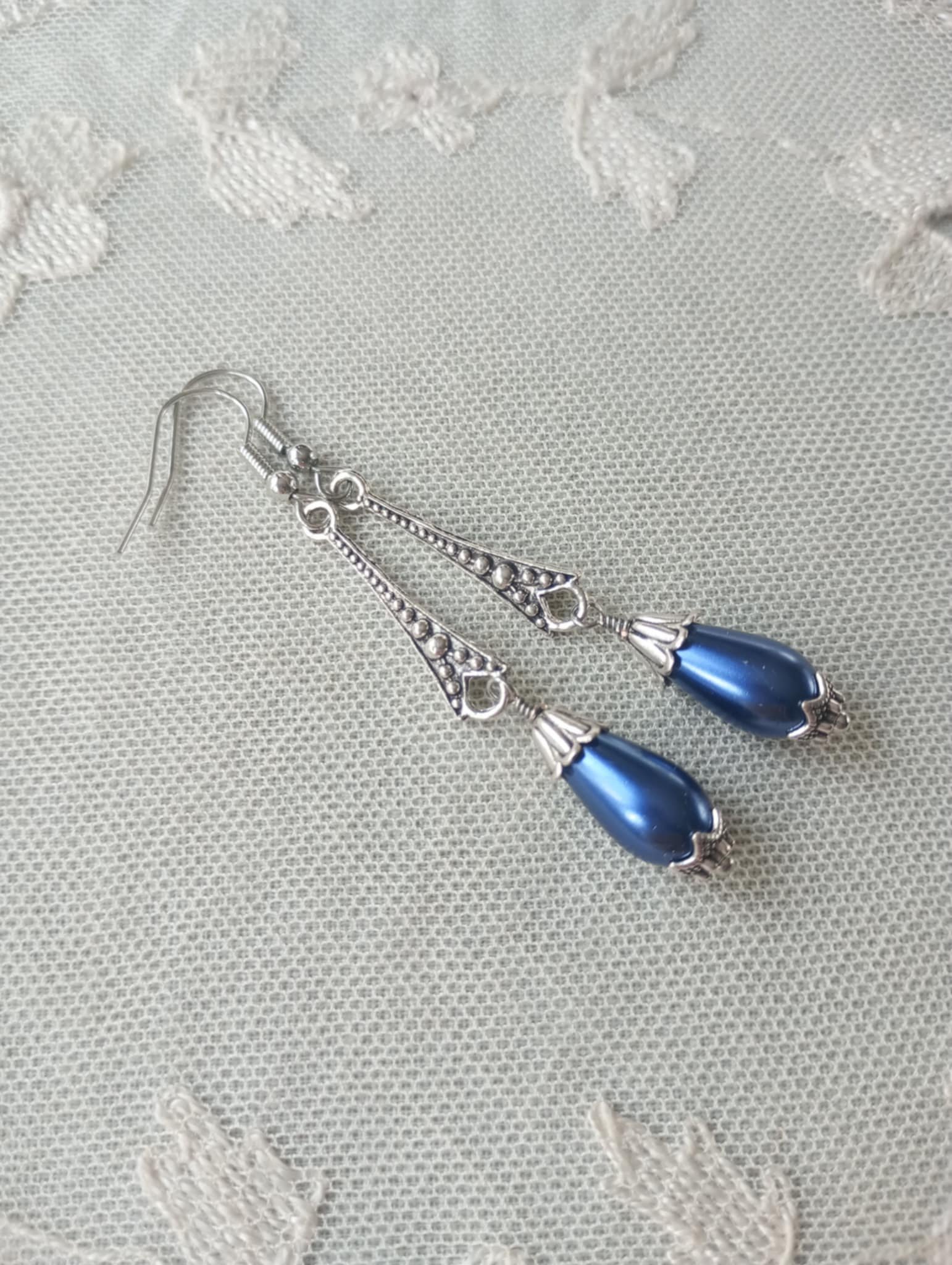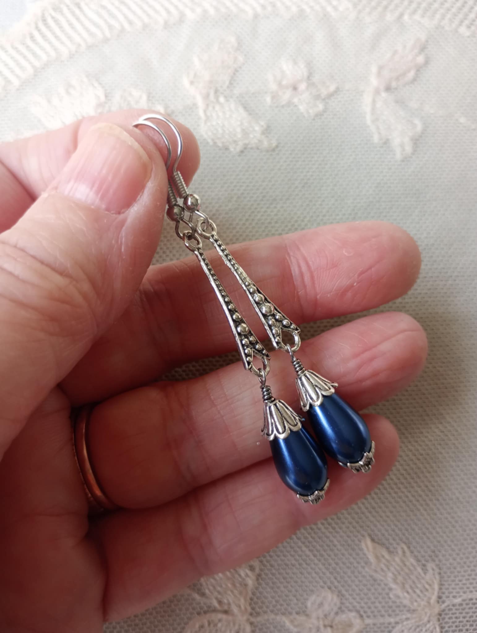 Handmade vintage style elegant dangle earrings inspired by the Roaring 20s. Created using "Montana" blue glass pearl beads and antiqued silver plated tapered bar connectors with raised dot pattern and fluted bead caps. Please see all photographs for different views.