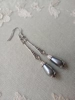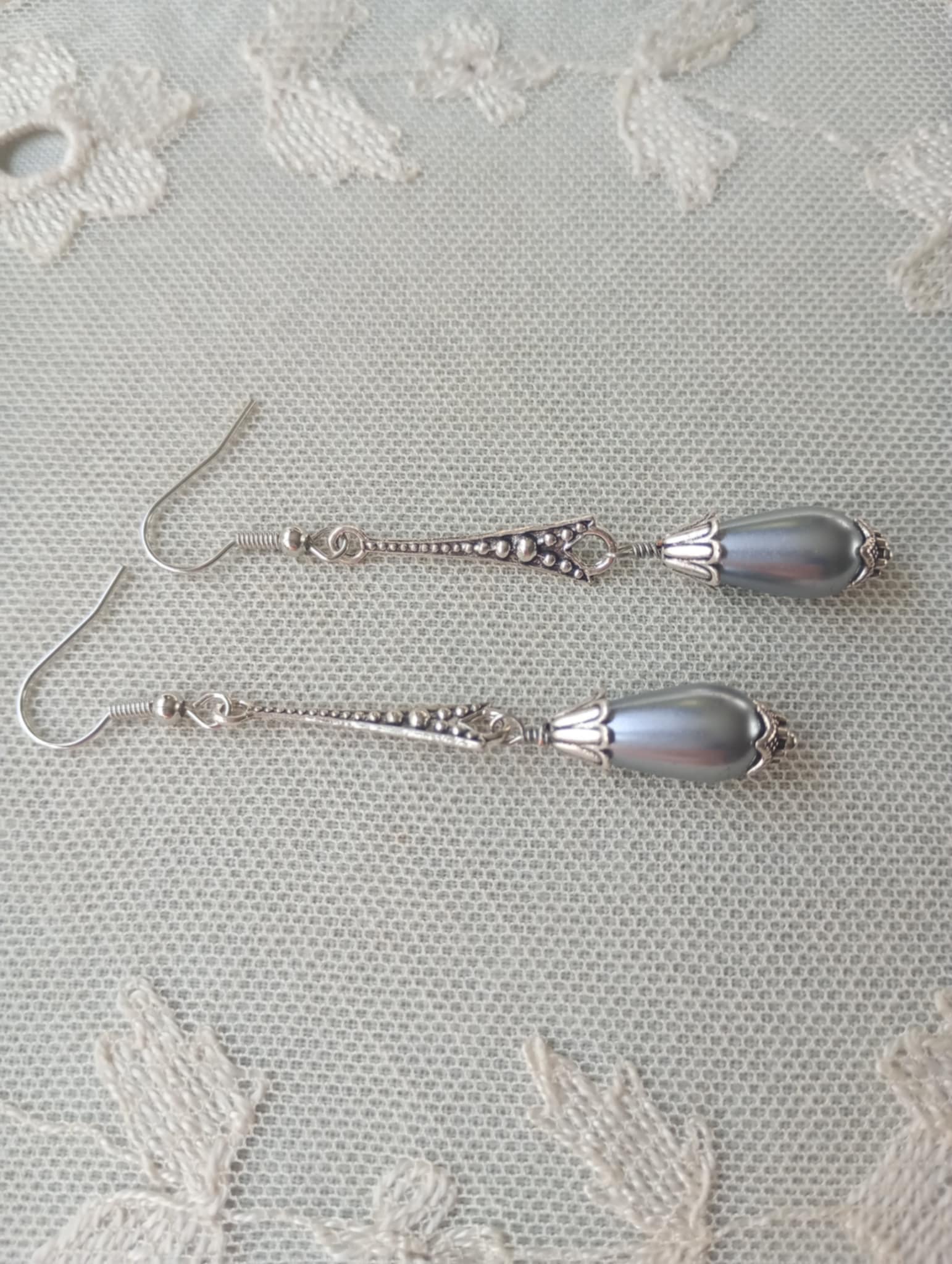 Handmade vintage style elegant dangle earrings inspired by the Roaring 20s. Created using silver grey glass pearl beads and antiqued silver plated tapered bar connectors with raised dot pattern and fluted bead caps. Please see all photographs for different views.