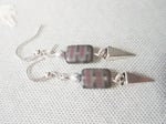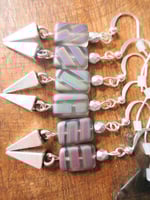 These quirky limited edition earrings were handmade by me inspired by the alternative styles of the late 70s-early 80s post punk era, featuring beautiful frosted electroplated stripes design Czech Glass beads with metallic silver faceted beads and pyramid shaped dangle on silver plated hooks for pierced ears, also available with vintage style hinged screw back clip on clasps for non pierced ears, simply select style required from the drop down menu when placing your order.