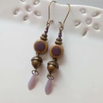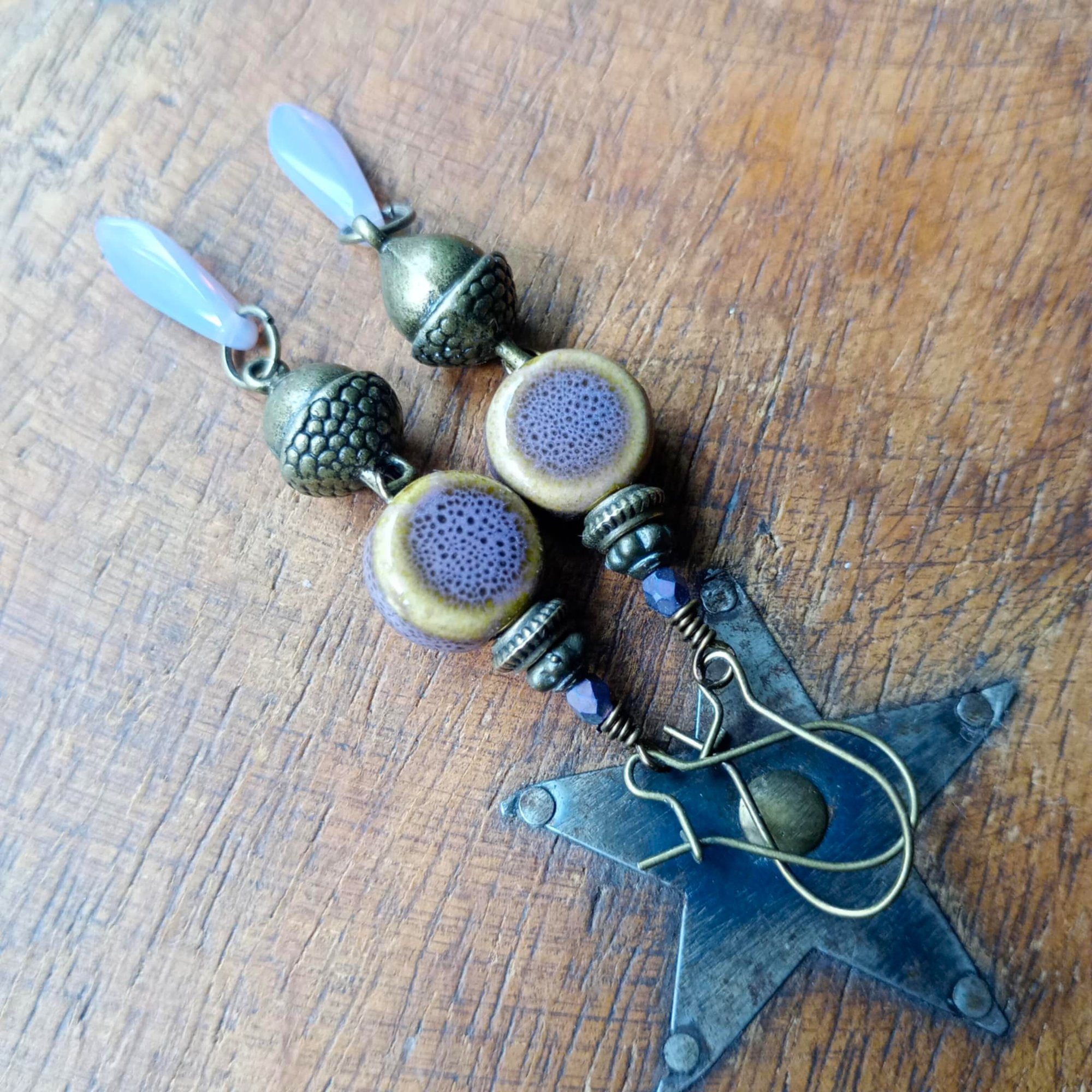 These limited edition Boho style statement dangly earrings were handmade by me and feature beautiful metallic and opalescent purple Czech glass faceted and dagger shaped beads paired with speckled purple rustic ceramic Coin/Discs and interspersed with metal accents. These have been hand wired to a cast metal antique bronze acorn focal piece, with secure kidney style latch hooks for pierced ears.