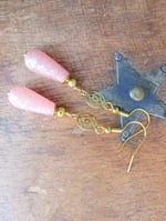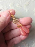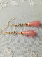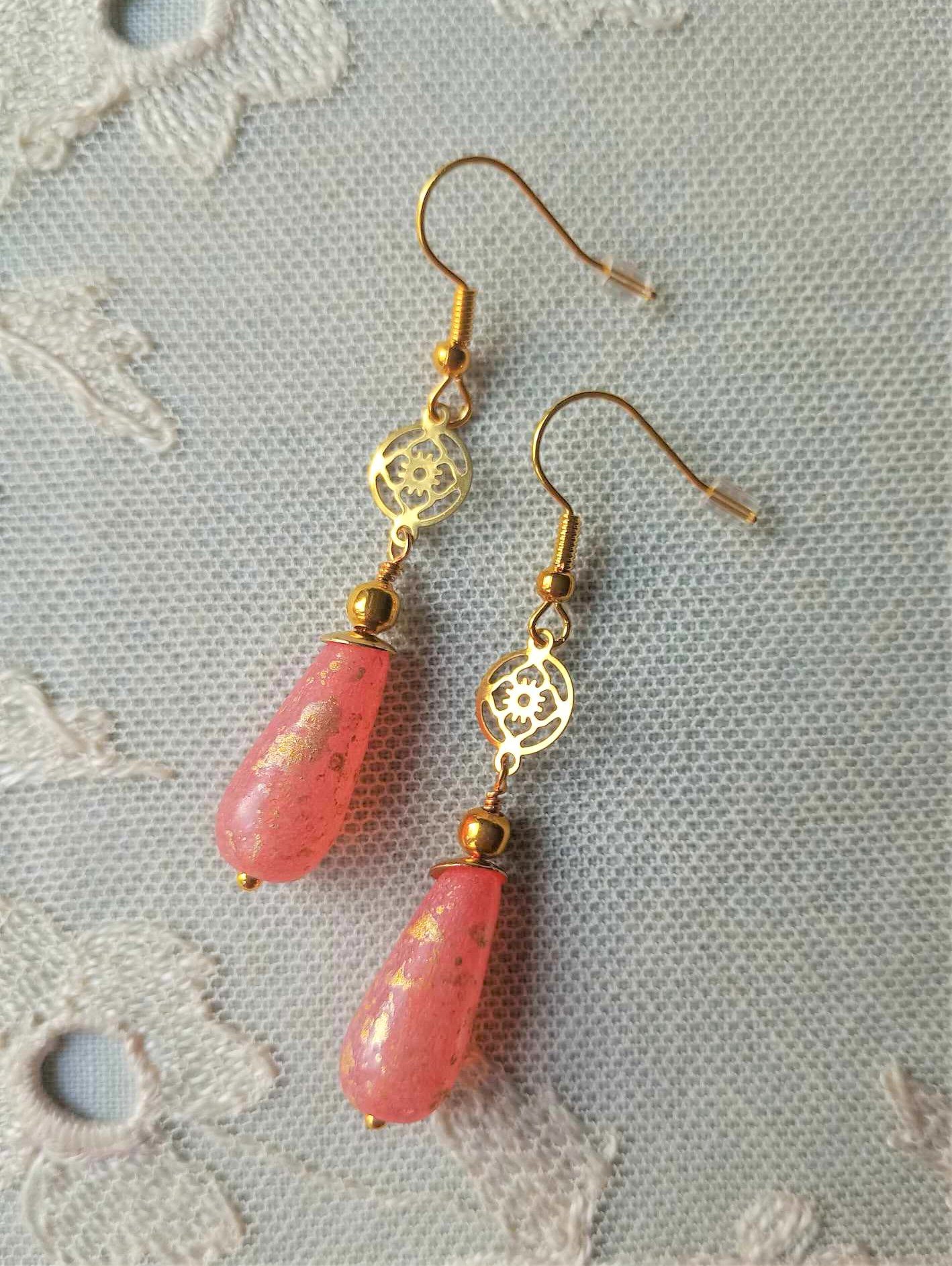 Handmade vintage style elegant dangle earrings inspired by the 1920s Art Deco era. Created using beautiful frosted salmon pink Czech glass teardrop beads with gold mottling and pretty openwork punched out gold plated brass disc focals paired with gold plated details and hooks for pierced ears, also available with vintage style screw back hinged clip on clasps for non pierced ears and secure fan detail vleverback closures for pierced ears.
