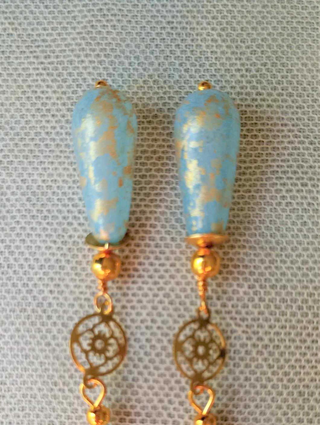 Art deco gold floral cut out earrings handmade with sky blue & gold splash Czech glass drops