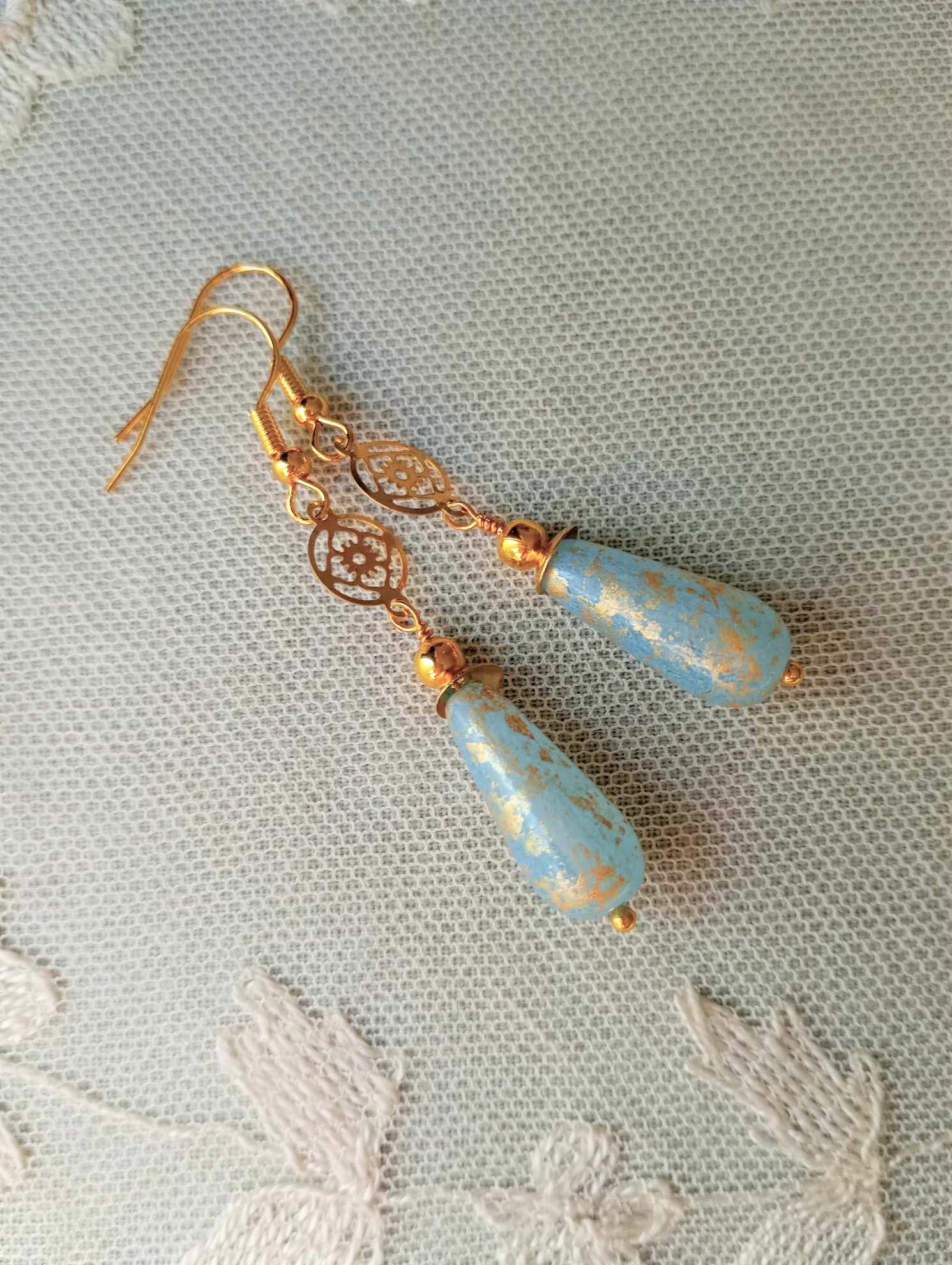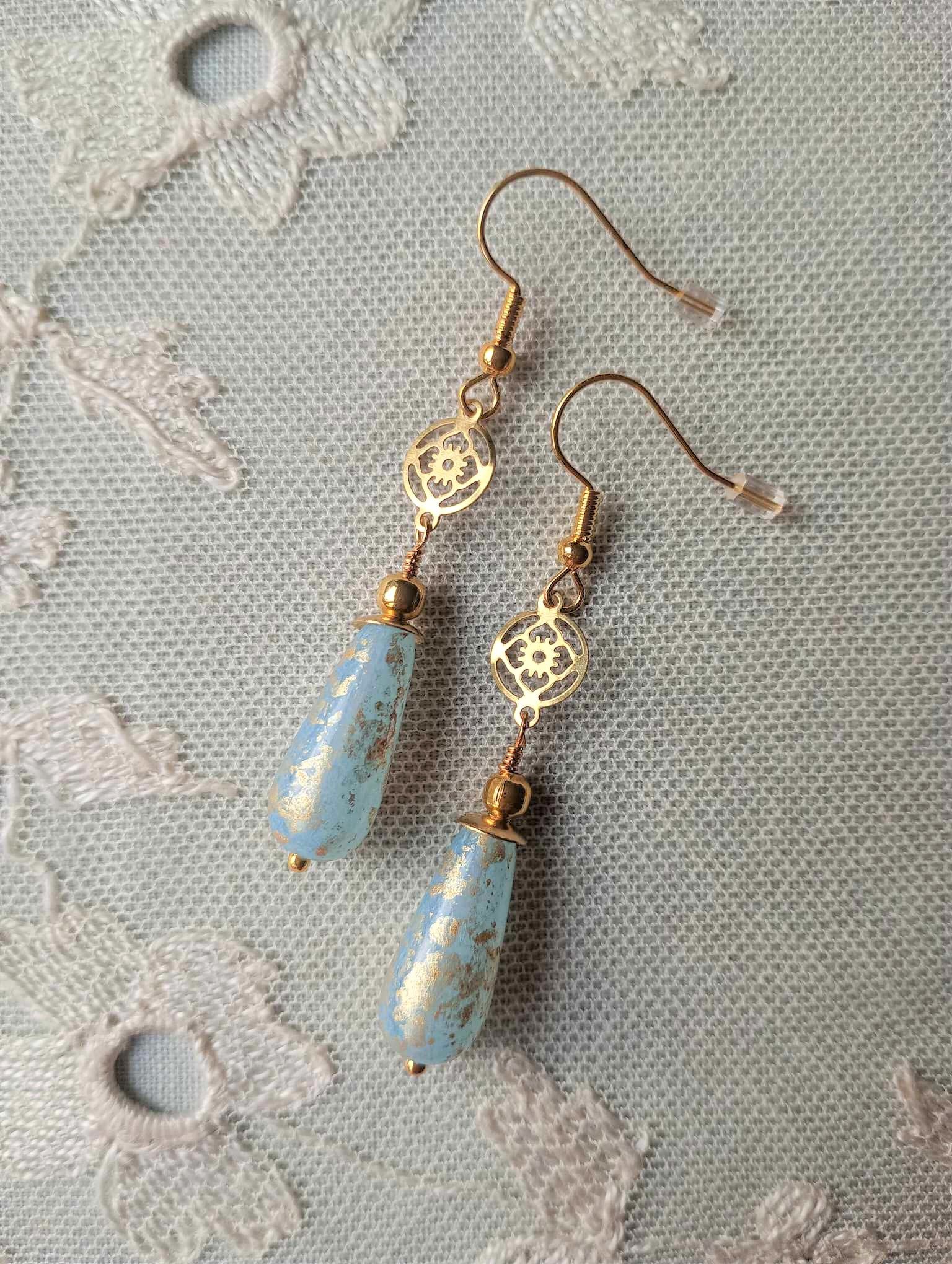 Handmade vintage style elegant dangle earrings inspired by the 1920s Art Deco era. Created using beautiful frosted sky blue Czech glass teardrop beads with gold mottling and pretty openwork punched out gold plated brass disc focals paired with gold plated details and hooks for pierced ears, also available with vintage style screw back hinged clip on clasps for non pierced ears and secure fan detail vleverback closures for pierced ears.