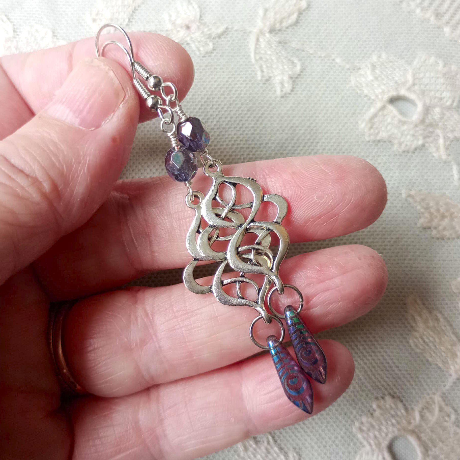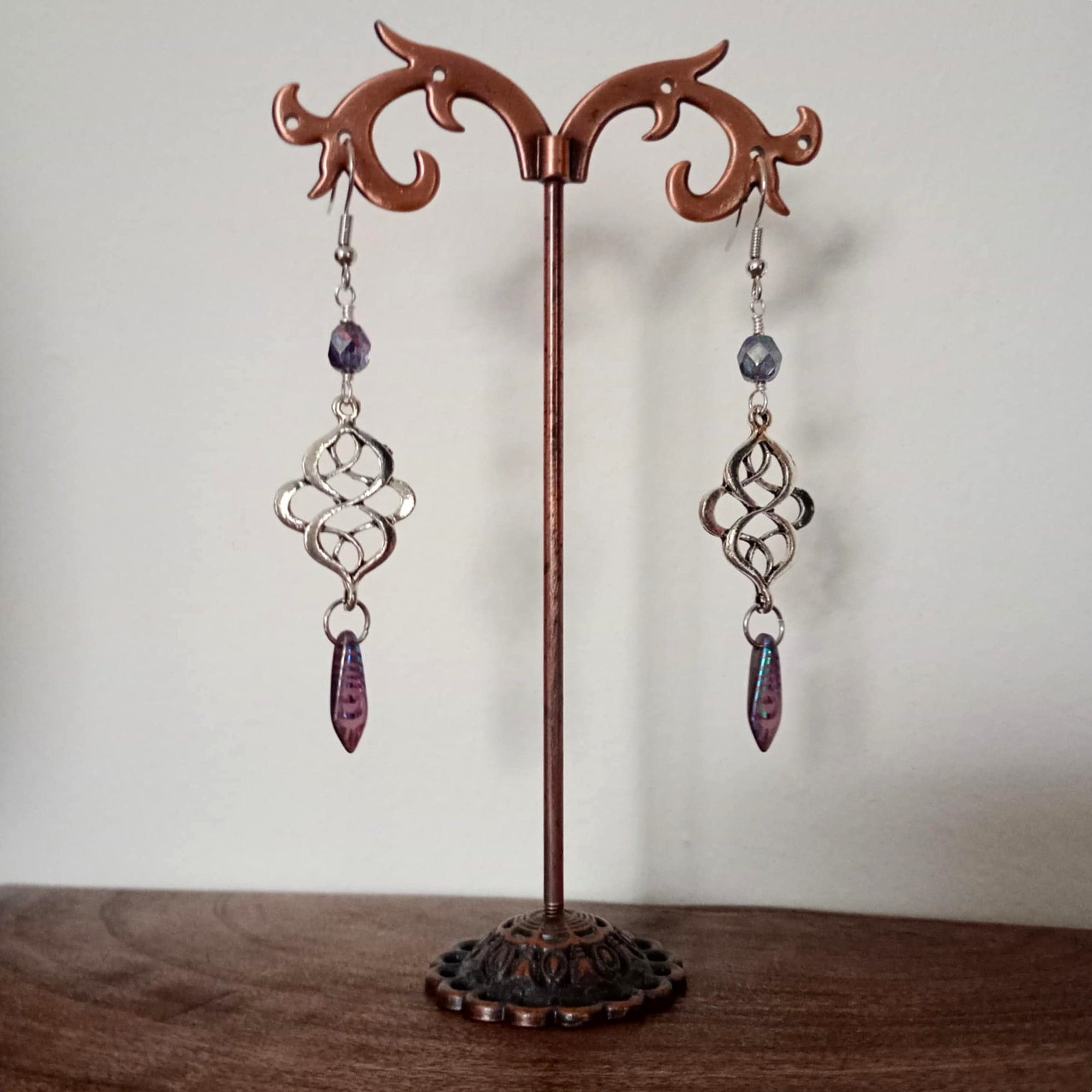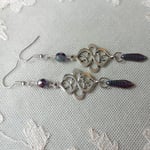 Created using pretty transparent purple "picasso lustre" finish Czech glass faceted beads hand wired to celtic inspired endless knot metal focals with a hanging peacock feather motif Czech dagger bead with fish hook style closures for pierced ears, also available with vintage style hinged screw back clip on clasps for non pierced ears, simply select which closure you require from the drop down when placing your order.