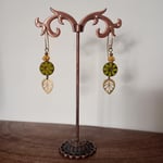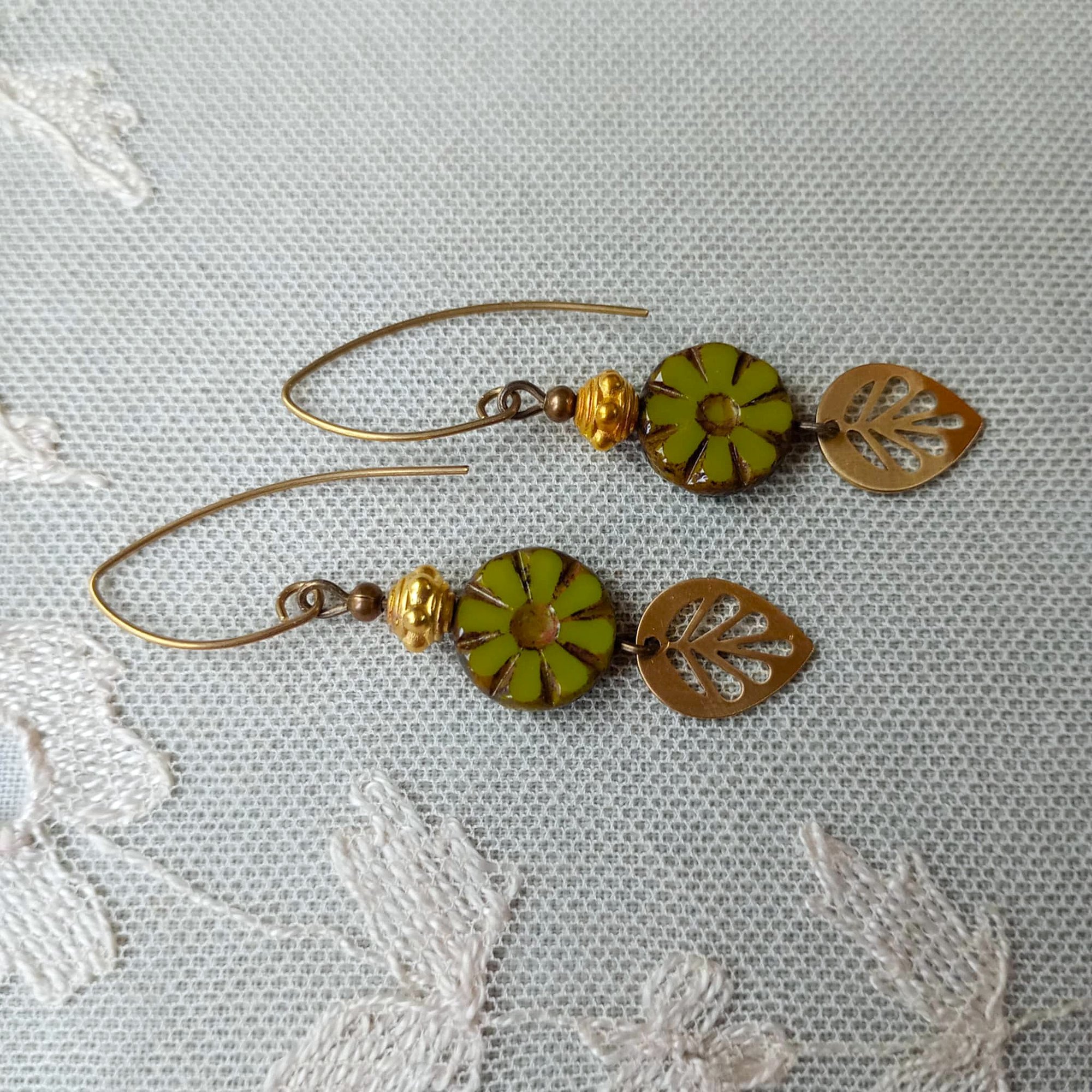 These contemporary boho style earrings were handmade by me and feature aged Czech glass daisy wheel coin shaped beads in opaque "olivine" green, paired with matt gold and bronze metal beads and a polished golden raw brass stylised leaf shaped dangle with cut out detal, hung on unusually shaped handmade antique brass hooks with an elongated length behind the ear for pierced ears.