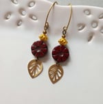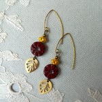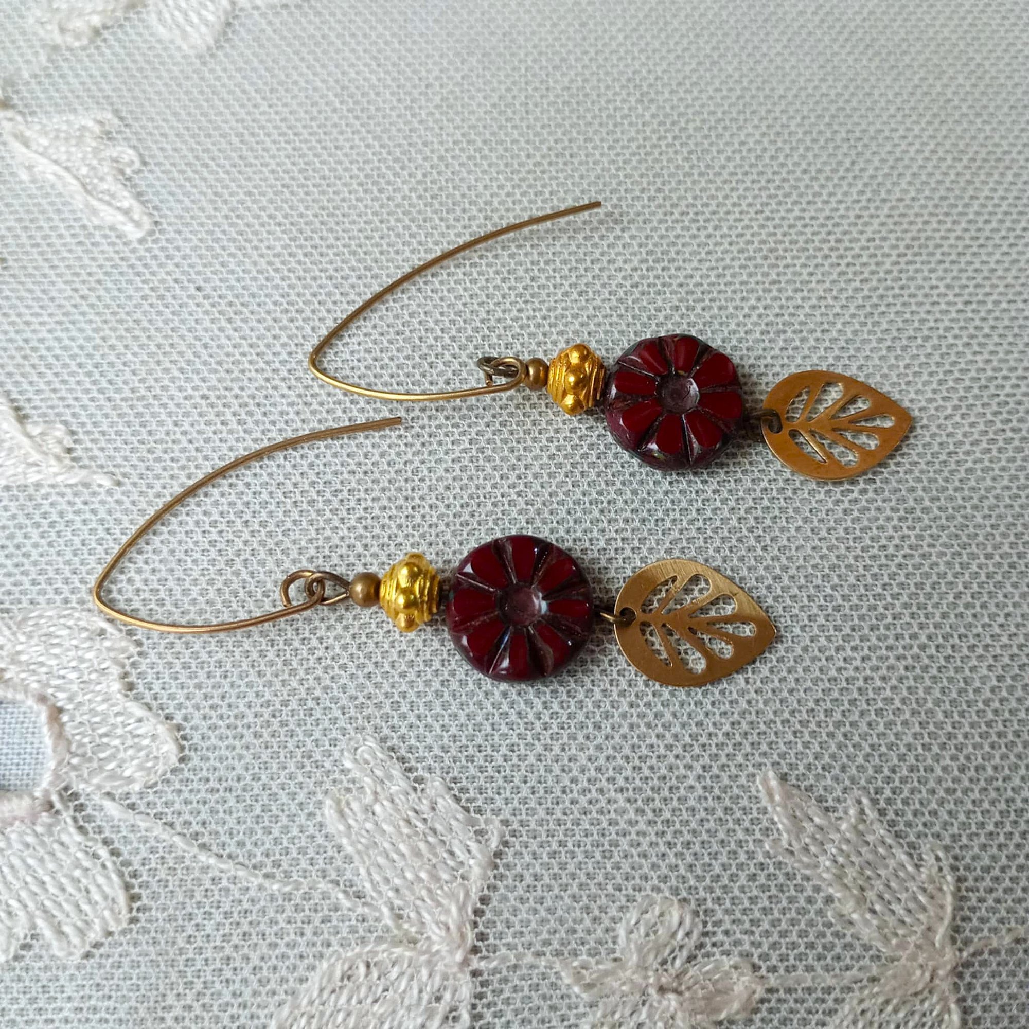 These contemporary boho style earrings were handmade by me and feature aged Czech glass daisy wheel coin shaped beads in opaque "oxblood" red, paired with matt gold and bronze metal beads and a polished golden raw brass stylised leaf shaped dangle with cut out detal, hung on unusually shaped handmade antique brass hooks with an elongated length behind the ear for pierced ears.