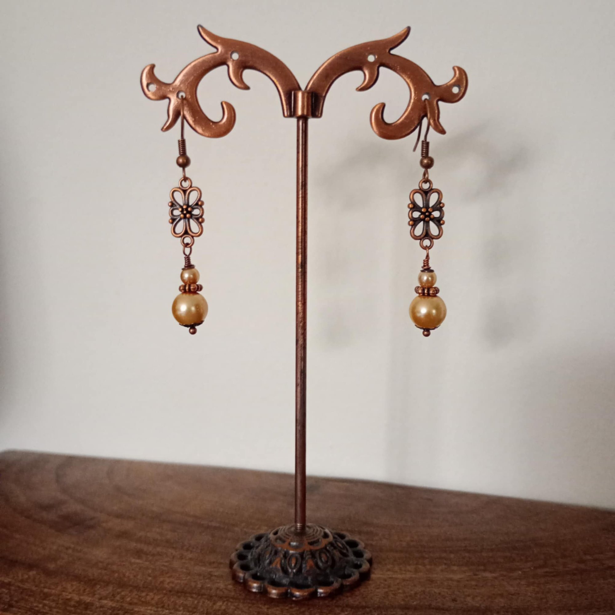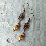 Handmade Vintage style flower detail elegant pearl dangle earrings inspired by the Edwardian era . Created using beautiful round glass pearls in a light caramel colour, copper beads and antique copper lightweight openwork metal focal with a stylised floral design and filigree bead caps.