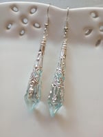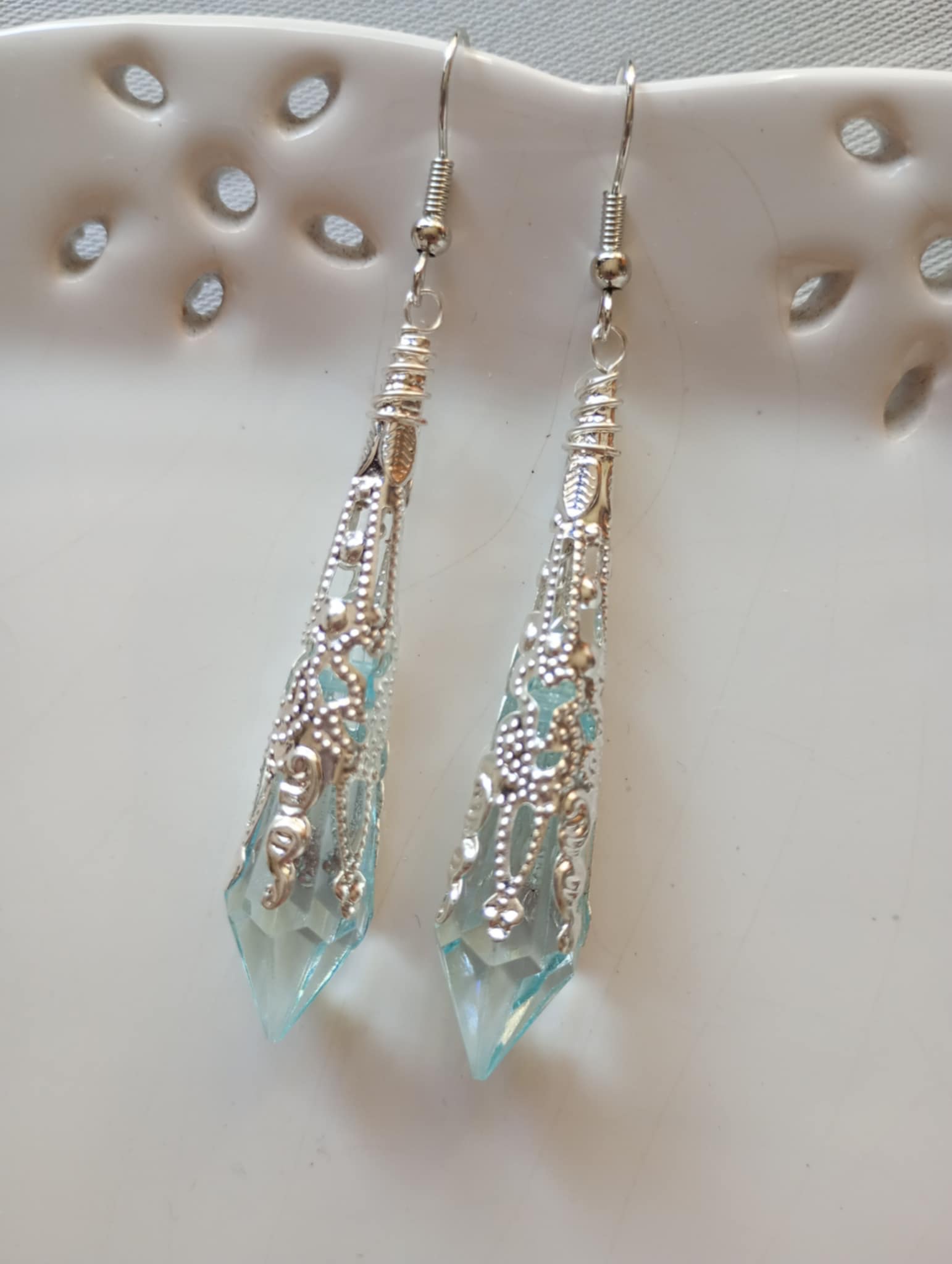 Created using pastel blue faceted acrylic crystal beads which are wrapped in stamped & pierced thin metal filigree silver plated cones with fan detail secure lever back closures for pierced ears.