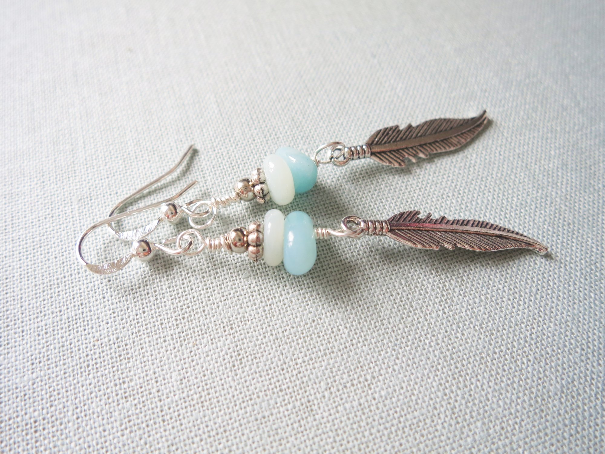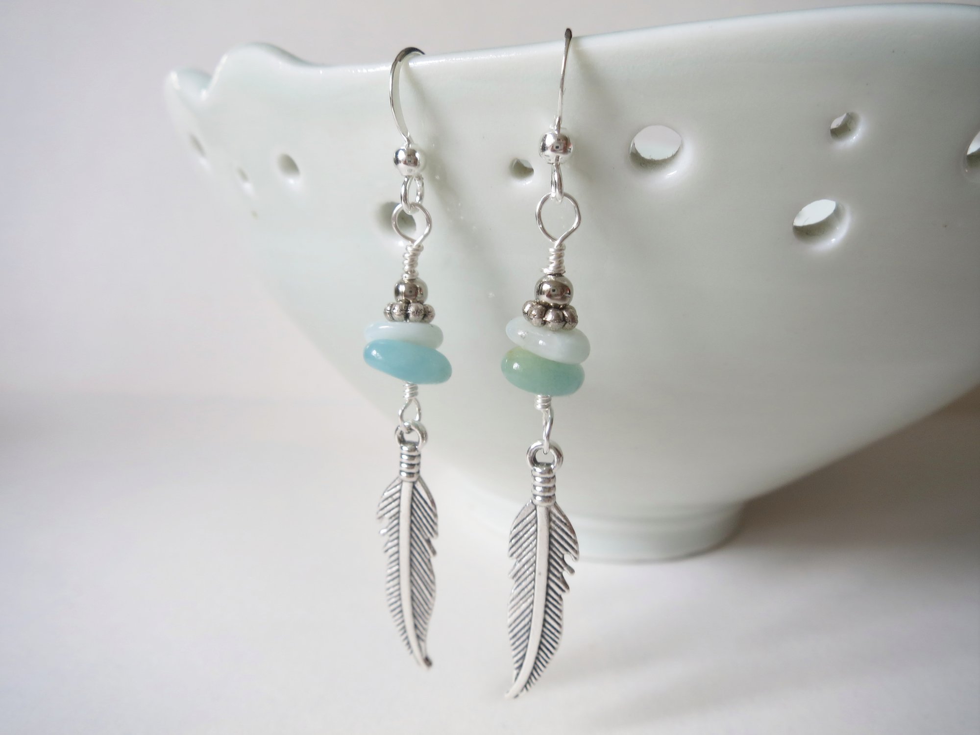 These delicate summery boho style dangle earrings were handmade by me and feature beautiful irregular shaped amazonite polished pebbles and Tibetan silver feather charm dangles.