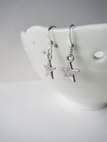 Featuring Tibetan silver five point star shaped charms on silver plated fish hook style wires for pierced ears.