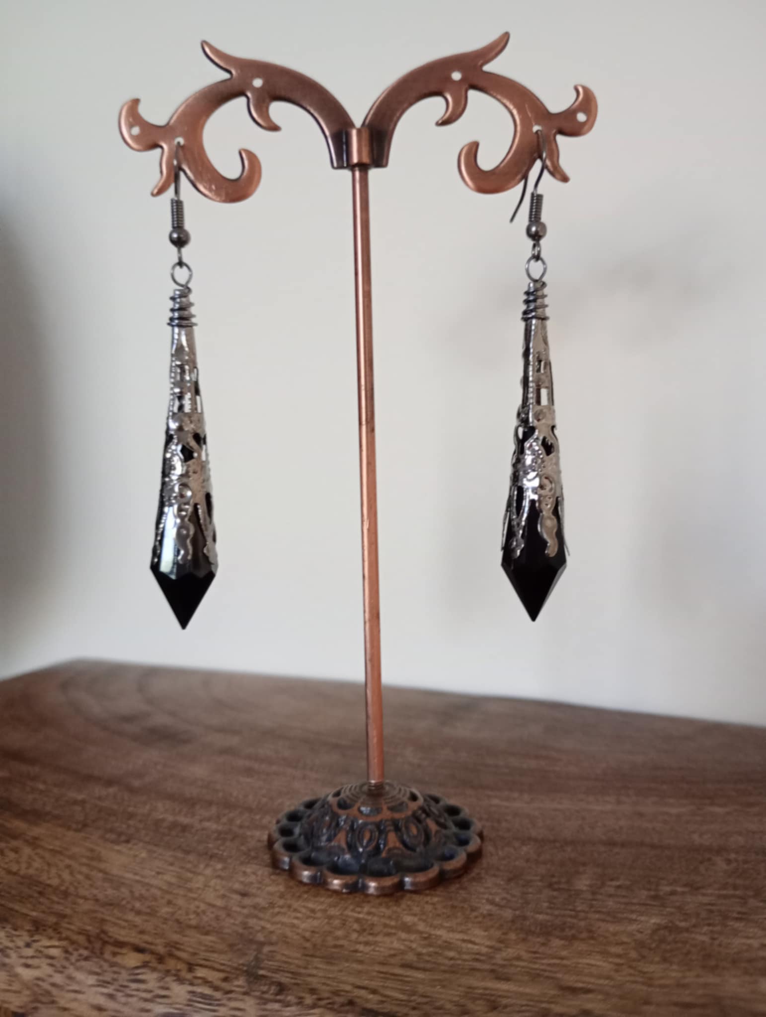 Vamp Ornate Pointed Earrings, Black & Gunmetal, Pierced or Clip On