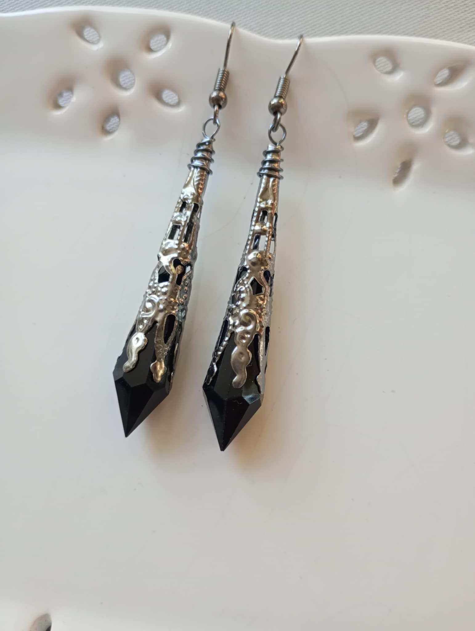 Created using Jet Black faceted acrylic crystal beads which are wrapped in stamped & pierced thin metal filigree gunmetal cones with fan detail secure lever back closures for pierced ears.