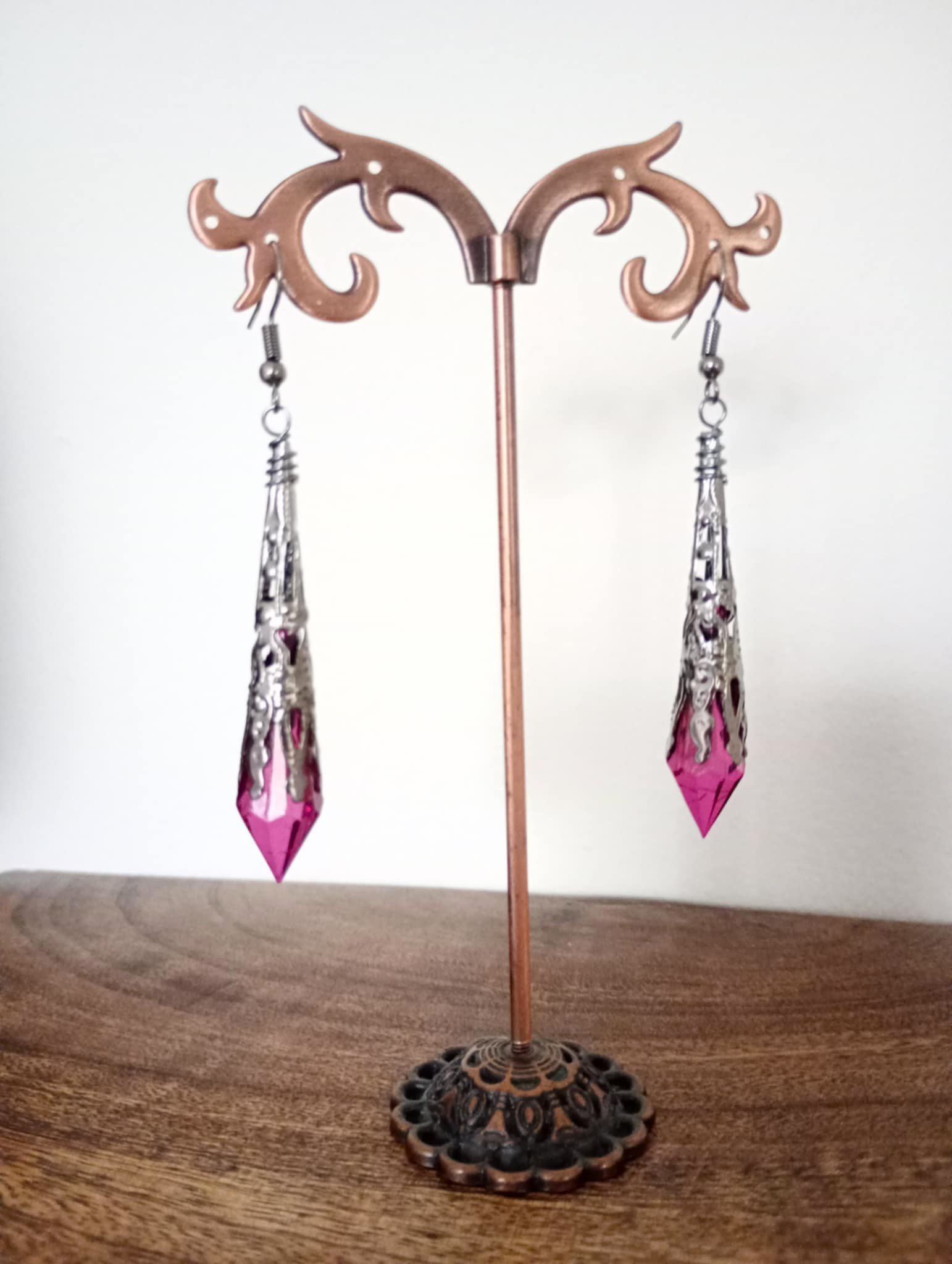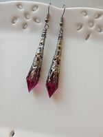 Created using Cerise faceted acrylic crystal beads which are wrapped in stamped & pierced thin metal filigree gunmetal cones with fan detail secure lever back closures for pierced ears.