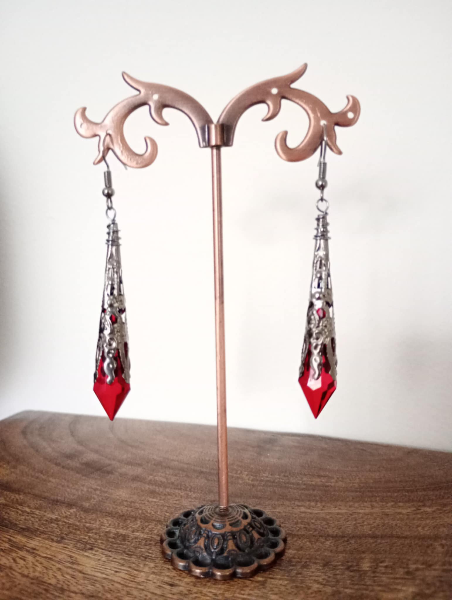 Vamp Ornate Pointed Earrings, Red & Gunmetal, Pierced or Clip On