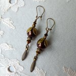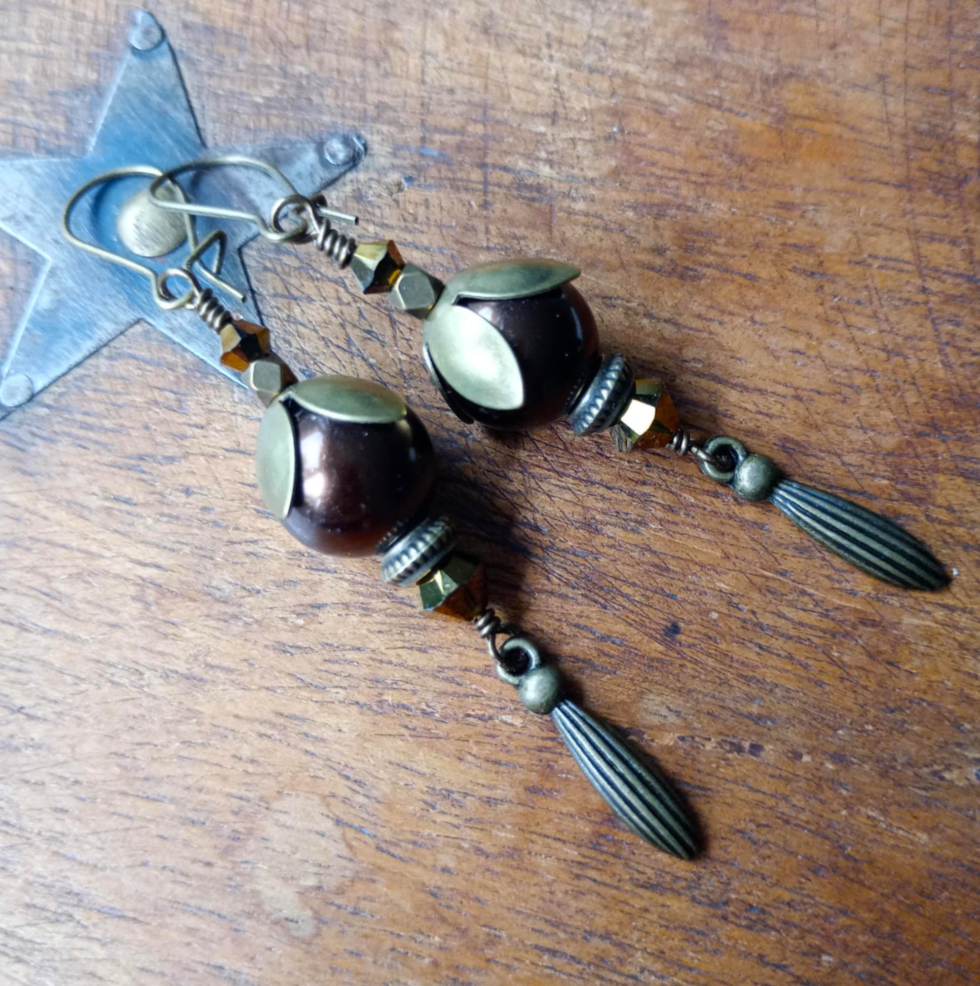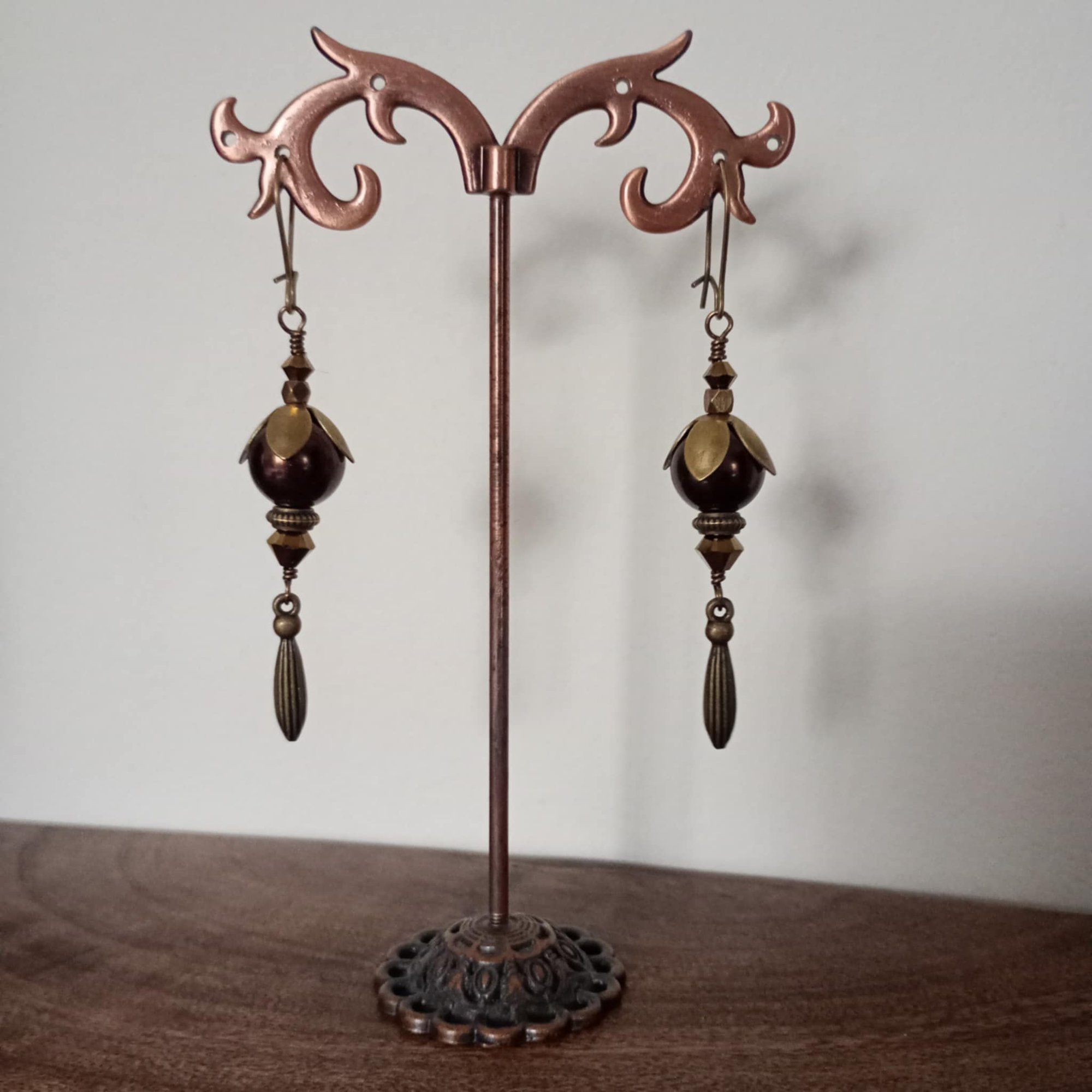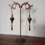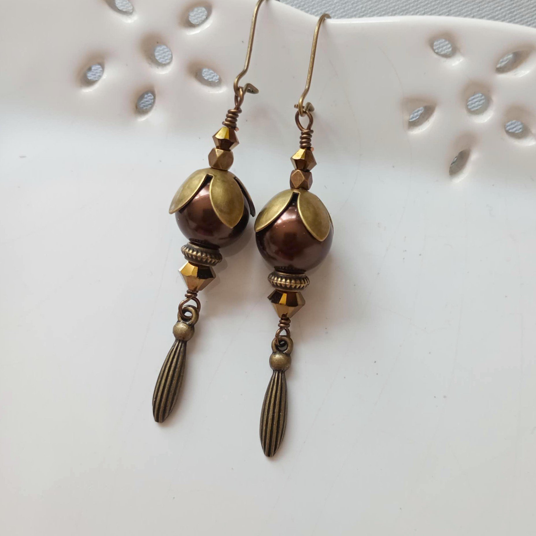 These limited edition antique inspired earrings were handmade by me inspired by the jewellery of the Victorian era and feature beautiful sparkling metallic bronze Austrian crystal elements paired with rich chocolate brown glass pearls metal beads and caps which have been hand wired with a fluted petal shaped drop at the bottom of each earring, shown with antique bronze kidney style latch hooks for pierced ears.